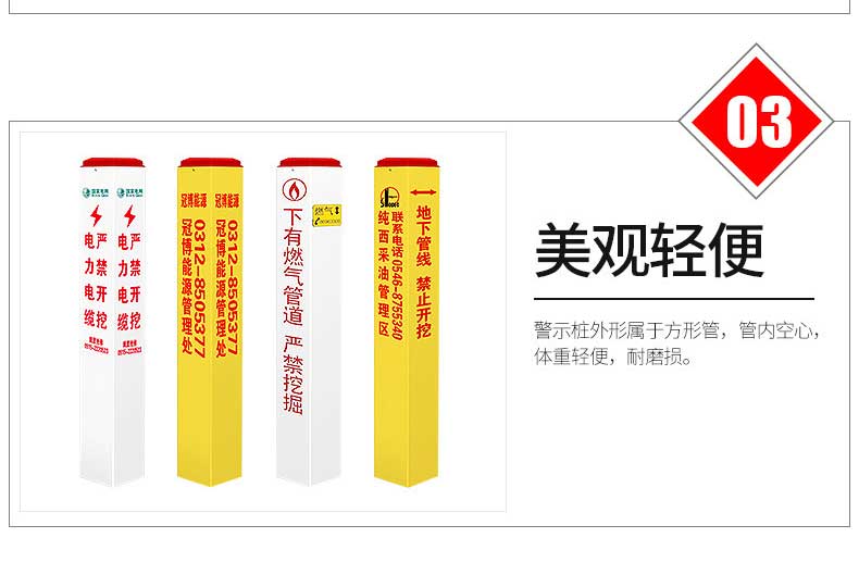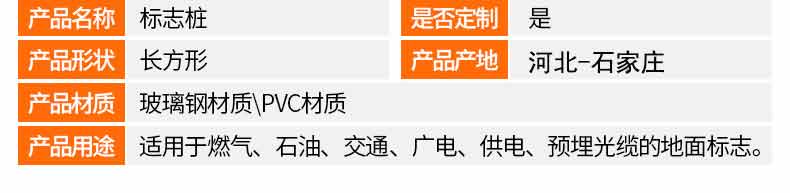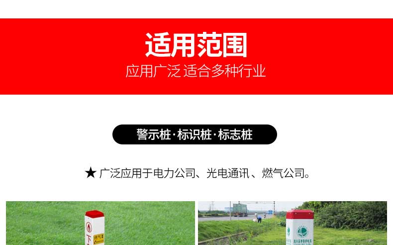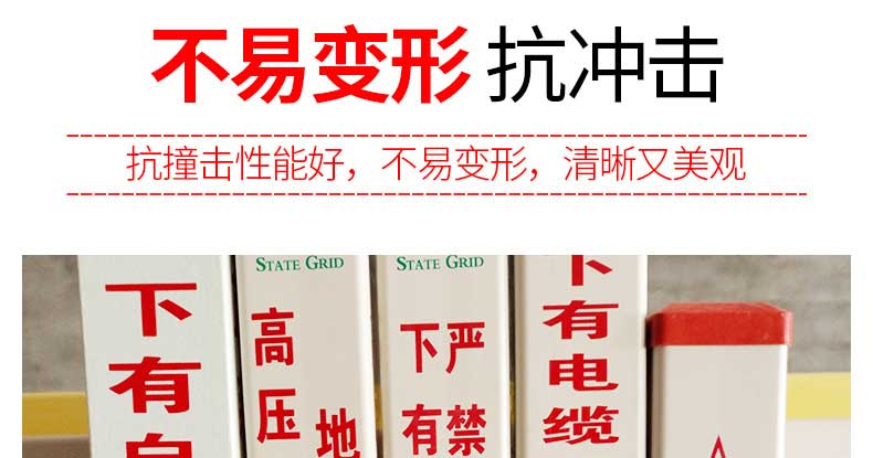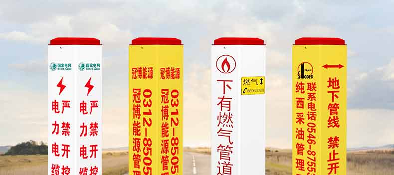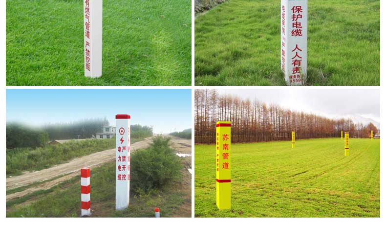 標(biāo)志樁又稱為警示樁、標(biāo)識樁、標(biāo)志樁,常用于電力、通信、燃?xì)?、自來水、鐵路地埋管線路徑指示標(biāo)志。用于戶外、綠化帶、灌木叢、頂管兩側(cè)管線路徑指示,起到警示作用的新型產(chǎn)品。