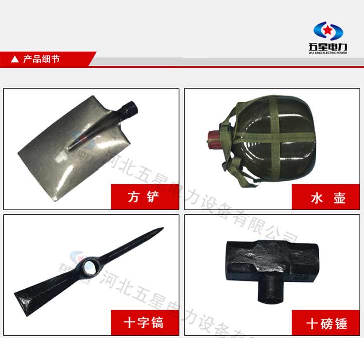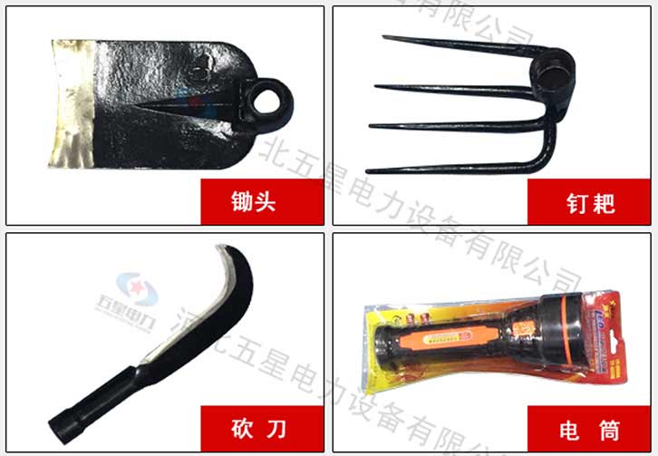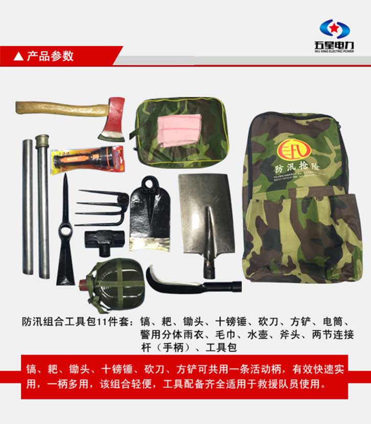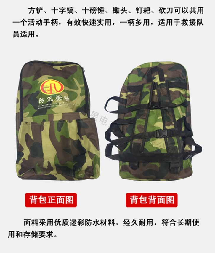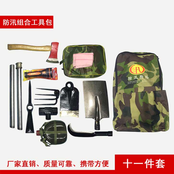 防汛組合工具包十一件套:鎬、鈀、鋤頭、十磅錘、砍刀、方鏟、電筒、警用分體雨衣、毛巾、水壺、頭盔。共用一條活動柄。該組和輕便,工具配備齊全適用于救援隊(duì)員使用。
