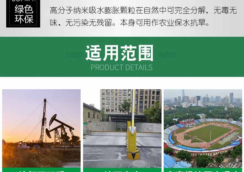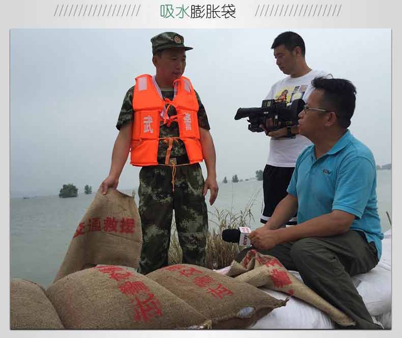 采用以水治水的新理念:在防汛搶險緊急時刻無處尋找砂石土料,可以將吸水膨脹袋放入水中,3分鐘可迅速膨脹到20-25公斤,代替人工裝沙填土的防汛沙袋時代,也可以直接將吸水膨脹袋投放到管涌口,快速封堵堤壩管涌,廣泛用于防洪搶險,堤壩管涌,河堤堵漏,堤防漏洞、漫溢搶護,防洪堤防的臨時性加高,臨時性防水圍城的構(gòu)筑,水庫,江河大堤滲水滑坡,護坡防沖,工程截流,暗溝和暗洞的堵塞。用于庫房,庭院,溝塘,被淹耕地排水;用于容易淹水的工廠,隧道,地下停車場,地鐵等領(lǐng)域作為防落水的使用;用于市政設(shè)施、道路施工,工地橋梁建設(shè),競賽場地等積水處吸水去水。是我國各地水利,水務(wù),防汛辦,防汛物資儲備及市政排水,和城市易澇區(qū)必備的應(yīng)急防汛儲備物資。