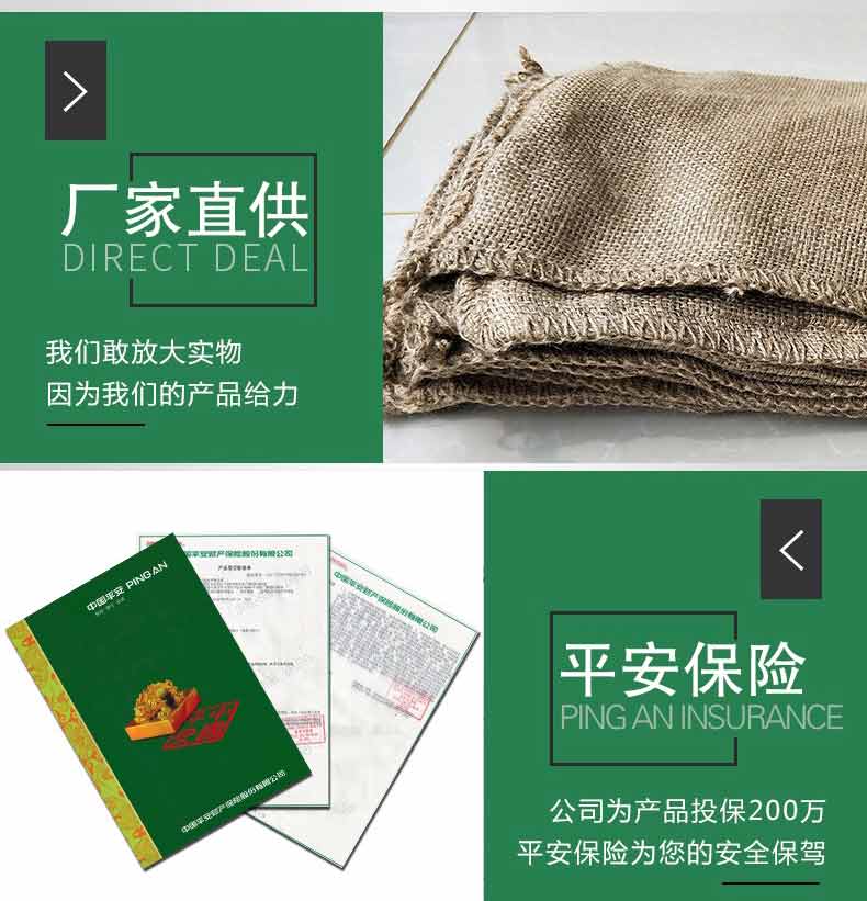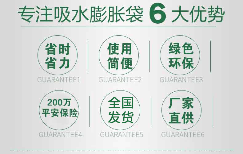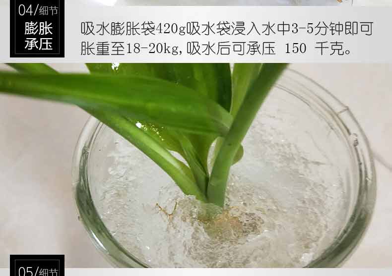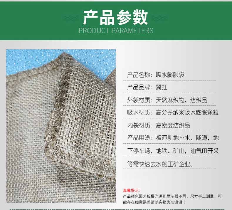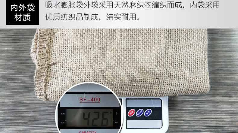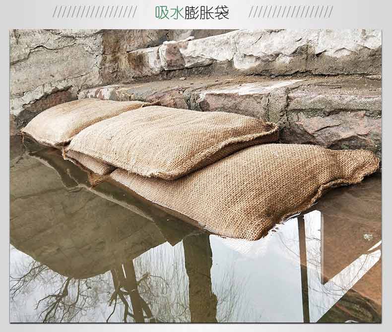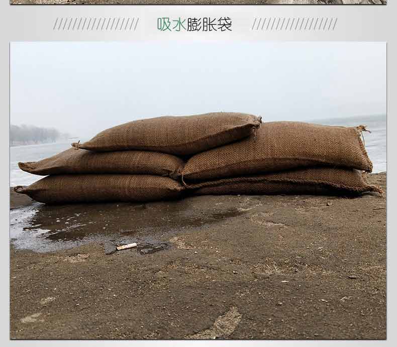 吸水膨脹袋內(nèi)裝的是新型的高分子納米吸水物質(zhì),這種物質(zhì)無毒、無味、無污染,吸水膨脹前為極小的顆粒物質(zhì),吸水后為黑豆大小的含水物質(zhì),干凈且無公害,待高分子吸水物質(zhì)使用后可用于農(nóng)業(yè)保水抗旱,所以在洪水過后可就地將袋內(nèi)的物質(zhì)傾倒入農(nóng)田中,在泥土中可完全分解,是綠色環(huán)保、一舉兩得的首選產(chǎn)品。外袋為純麻布和棉布織成,遇水后麻繩可更加結(jié)實耐磨。