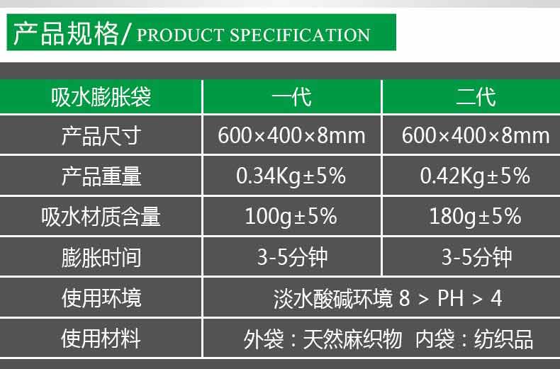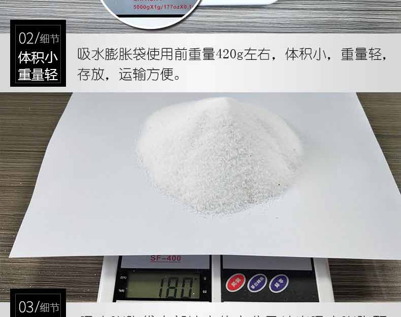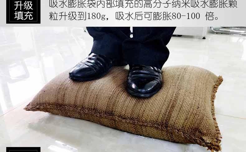 以水治水,快速膨脹,管涌以及快速構(gòu)筑擋水壩,封堵缺口,替代沙袋,替代沙袋和編織袋。操作簡單,攜帶運輸方便,遇水膨脹速度快,浸入水中 3 分鐘即可迅速膨脹至 18 ~ 20 千克,吸水膨脹袋 經(jīng)現(xiàn)場測試比沙土包堵截速度快9倍,使用時只需一人就可以完成,勞動強度大為減輕,無毒,無害,無味,無污染,可自然降解