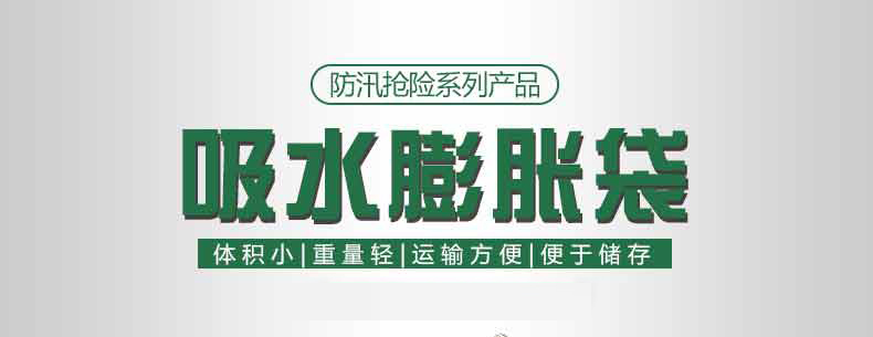 膨脹防洪袋,使用前體積小,重量輕,存放,運輸方便。與傳統(tǒng)的沙袋相比,在搶險防洪時大大減小時間和人力,另防洪搶險更有效率。吸水膨脹袋屬環(huán)保產(chǎn)品,無毒,無害,無味,無污染??勺匀唤到?。