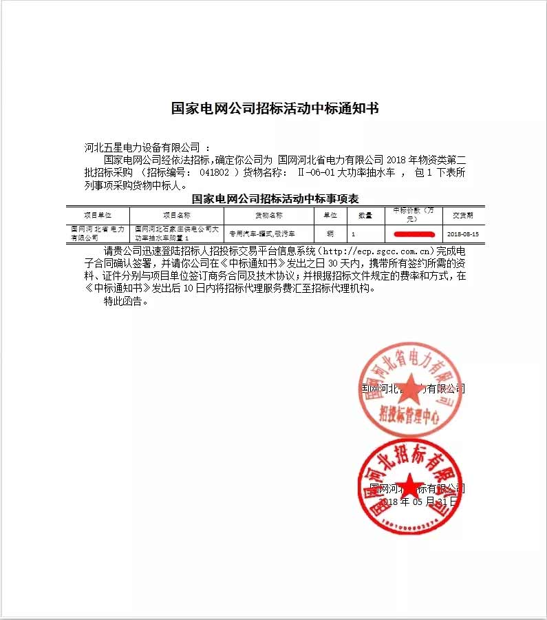 國(guó)家電網(wǎng)公司經(jīng)依法招標(biāo),確定河北五星公司為國(guó)網(wǎng)河北省電力有限公司“”2018 年物資類(lèi)第二批招標(biāo)采購(gòu) (招標(biāo)編號(hào): 041802 )”項(xiàng)目中,河北五星研制生產(chǎn)的“大流量應(yīng)急搶險(xiǎn)排澇車(chē)”一舉中標(biāo)??!